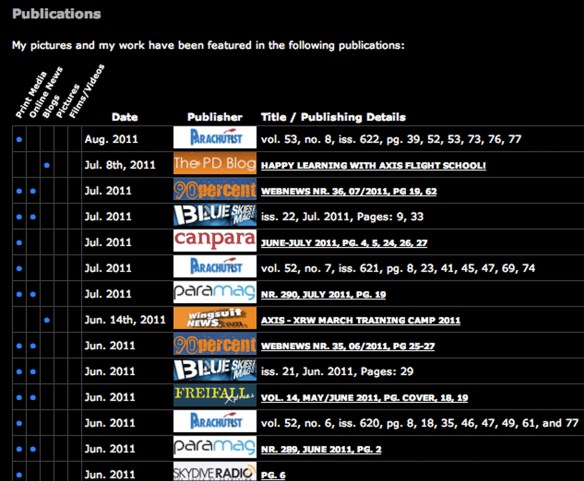 Over the last couple of years I have been compiling a list of all my publications. This list includes: Printed Media, Online News, Blog Posts, and Films/Videos. The majority of course is skydiving related. Please click on the image below to view the list in its entirety.