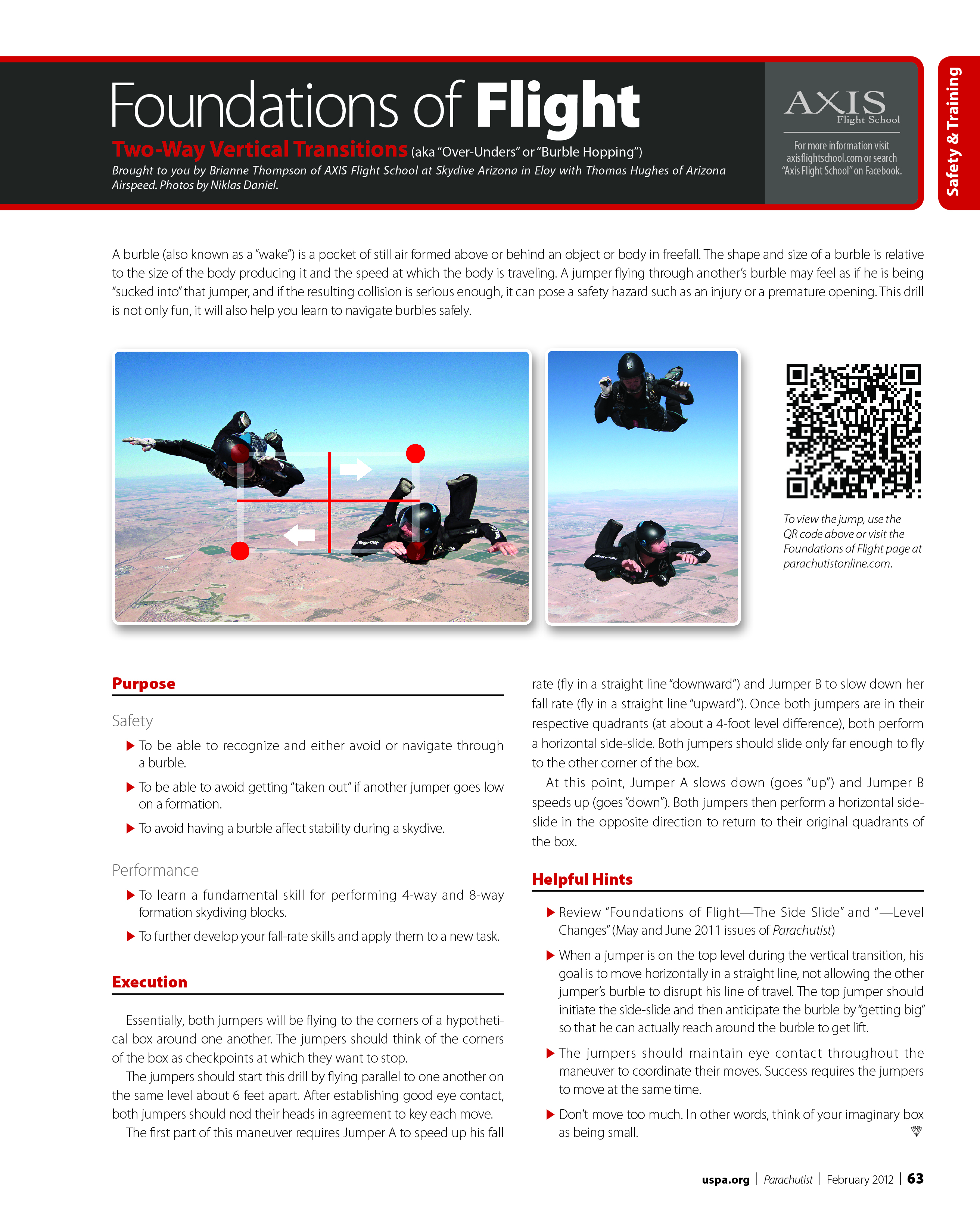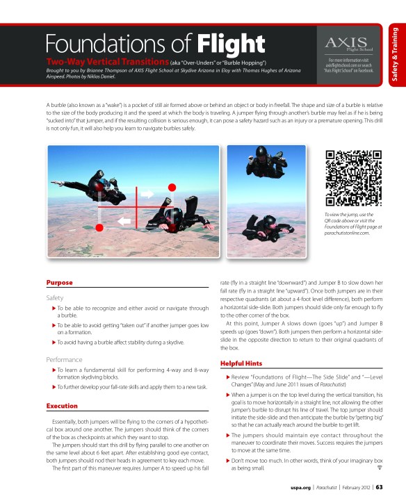 Welcome to February’s installment of AXIS Flight School‘s Foundations of Flight! This month we will be discussing how to do a two-way vertical transition while belly flying. A new feature we will be providing in future FOF editions, is the addition of a QR code. This square barcode can be photographed with any smart phone, thus allowing the reader to view the tutorial in a video format as well. Enjoy!