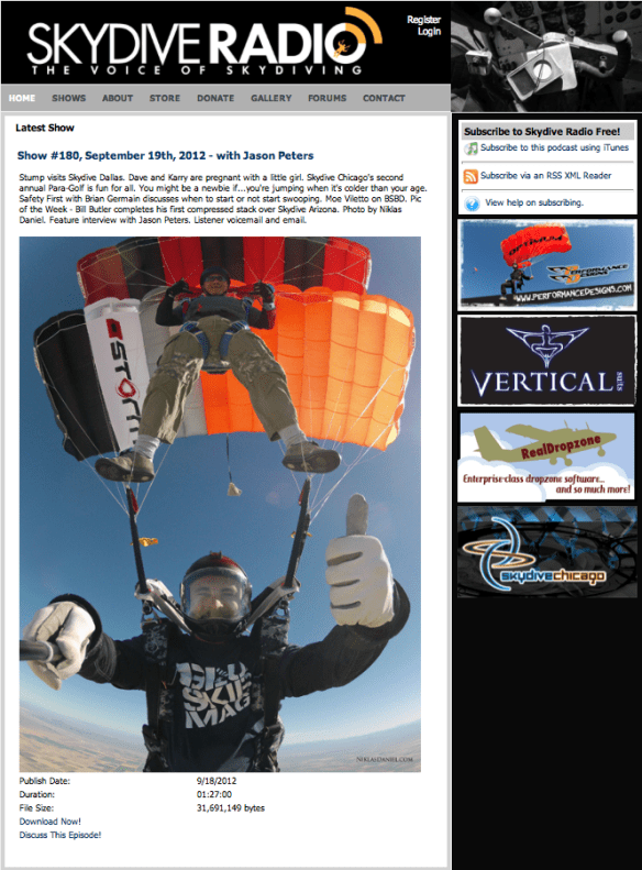 I would like to thank Dave at Skydive Radio for making my image below their photo of the week! Skydive Radio is the world’s leading internet radio show dedicated to the sport of skydiving. Weekly episodes include commentary, feature interviews with industry insiders, listener-contributed photos, and e-mails from an audience that spans the globe.