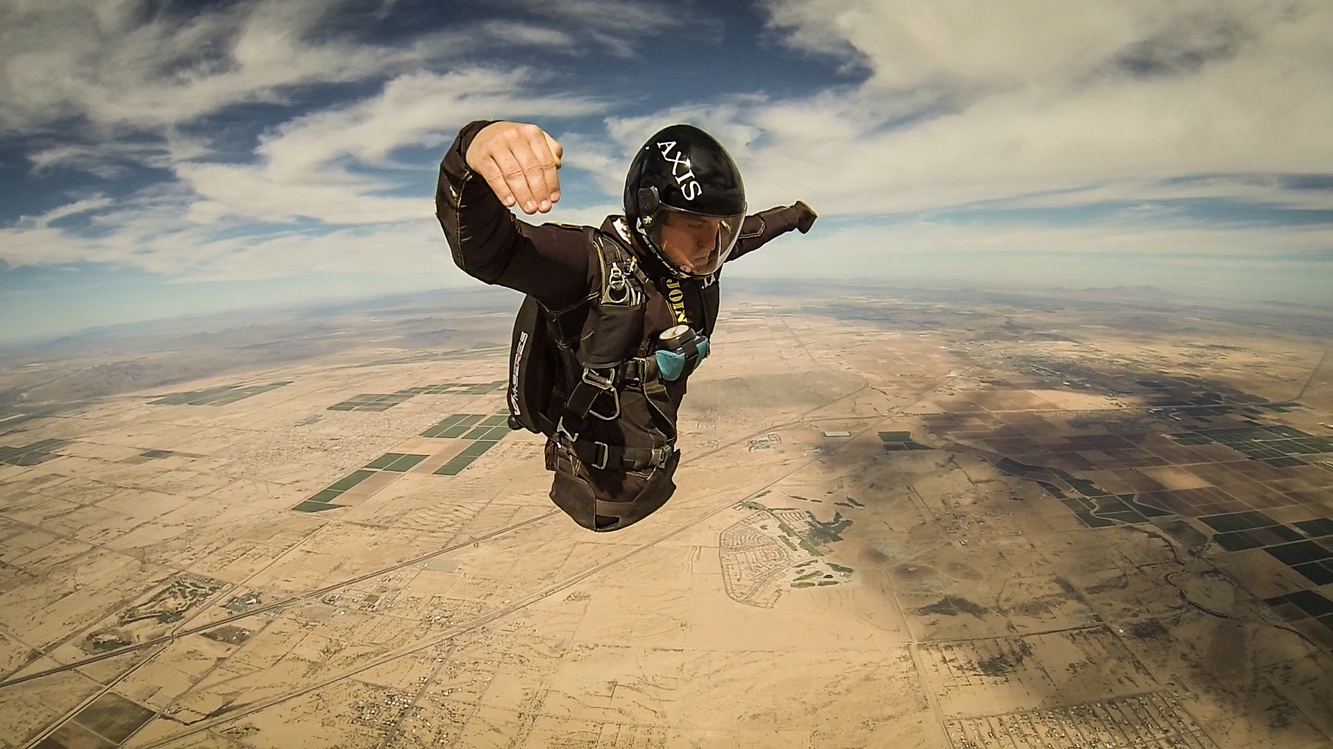 Todd flying with his Instructors Brianne Thompson of AXIS Flight School (to Todd’s right), and Tom Deacon (to Todd’s left). Also accompanying him are Skydive Arizona locals Sandy Radsek (red shirt), Ian Mackenzie, and 4-way Team Arizona Airspeed (Above Camera flyer is Justin Price of Airspeed).Todd Love during his grad jump over Skydive Arizona – flying in the head up orientation.