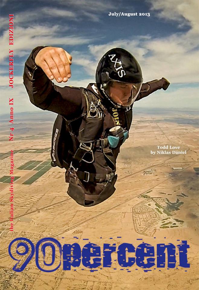 I would like to thank 90Percent (Italian Skydiving Magazine) for utilizing one of my Todd Love photographs for the July/August 2013 cover spot. It depicts Todd doing some head up flying during his A-License check dive over Skydive Arizona.
