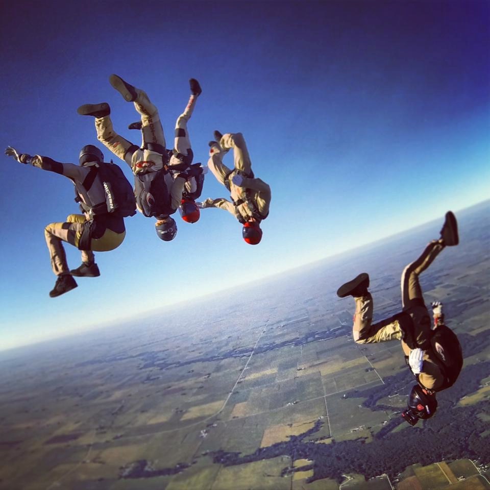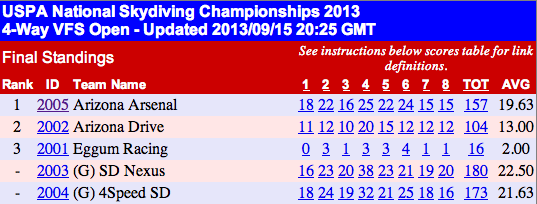 The 2013 USPA Nationals were held at Skydive Chicago (SDC) in Ottawa, IL. In the VFS category there were five teams in open (two of which were guests – SD Nexus & 4Speed SD), and five in advanced. The crisp 50 degree morning started with a 7am wheels-up for the 4-way VFS competitors. All 8 rounds were completed on the same day.