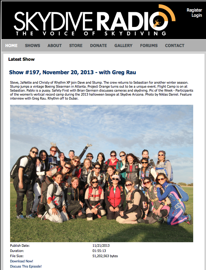 I would like to thank Dave at Skydive Radio for making my image below their pic of the week! Skydive Radio is the world’s leading internet radio show dedicated to the sport of skydiving.  Weekly episodes include commentary, feature interviews with industry insiders, listener-contributed photos, and e-mails from an audience that spans the globe.