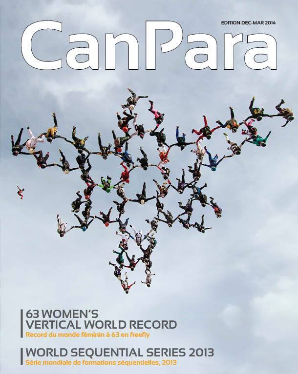 I would like to thank Canpara (Canadian Skydiving Magazine) for utilizing one of my WVWR photographs for the Dec-Mar 2014 cover spot. It depicts the new 63-way Women’s Vertical World Record over Skydive Arizona.