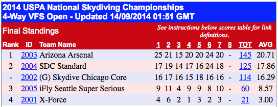 The 2014 USPA Nationals were held at Skydive Chicago (SDC) in Ottawa, IL. In the 4-way VFS category there were five teams in open, and five in advanced. Unfortunately the first three days of the competition were weathered-out, but all 8 rounds were completed on the the last day. The judges decided not to include round 7 in the final scoring, as some individuals were competing in multiple disciplines and were unable to complete the final round. SDC Standard XP was back after sitting out last year on its home turf at Skydive Chicago. Nexus, now SDC Core, has a new line up and competed as a guest team. iFly Seattle Super Serious completed its second nationals in addition to competing in the 2-way MFS discipline. X-FORCE is a newly formed VFS team from Skydive Arizona. Arizona Arsenal won gold at the 2013 USPA Nationals and then represented the USA at the FAI World Championship of Formation Skydiving 2014 in Prostejov just a couple of weeks earlier. Open Draw: