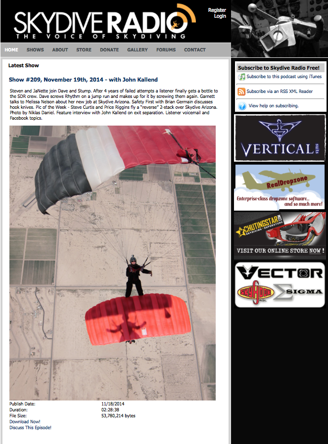 I would like to thank Dave at Skydive Radio for making my image below their pic of the week! Skydive Radio is the world’s leading internet radio show dedicated to the sport of skydiving.  Weekly episodes include commentary, feature interviews with industry insiders, listener-contributed photos, and e-mails from an audience that spans the globe.