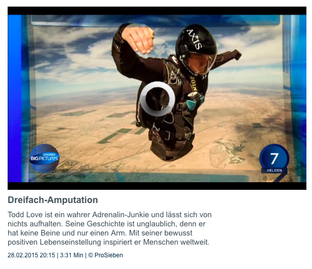 It has been over a year now since AXIS Flight School got to meet and jump with Todd Love (USMC veteran who lost both of his legs and his left hand to an IED in Afghanistan). On Saturday 28th February 2015, at 08:15, ProSieben (a German television channel) featured some of Todd’s video footage flying over Skydive Arizona on the show “Galileo Big Picture”.