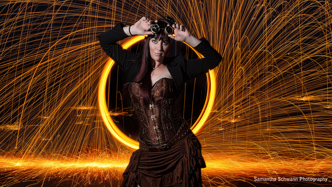 Brianne Thompson of AXIS Flight School rocking a steam punk outfit in the Arizona Desert.