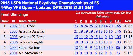 The 2015 USPA Nationals were held at Skydive Arizona (SDAZ) in Eloy, AZ. In the 4-way VFS category there were 6 teams in open, and 4 in advanced – a similar turnout to the previous year.
