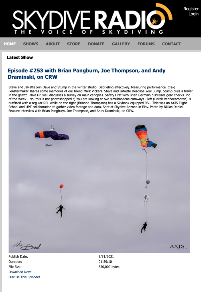 I would like to thank Dave at Skydive Radio for making my image below their pic of the week! Skydive Radio is the world’s leading internet radio show dedicated to the sport of skydiving. Weekly episodes include commentary, feature interviews with industry insiders, listener-contributed photos, and e-mails from an audience that spans the globe.