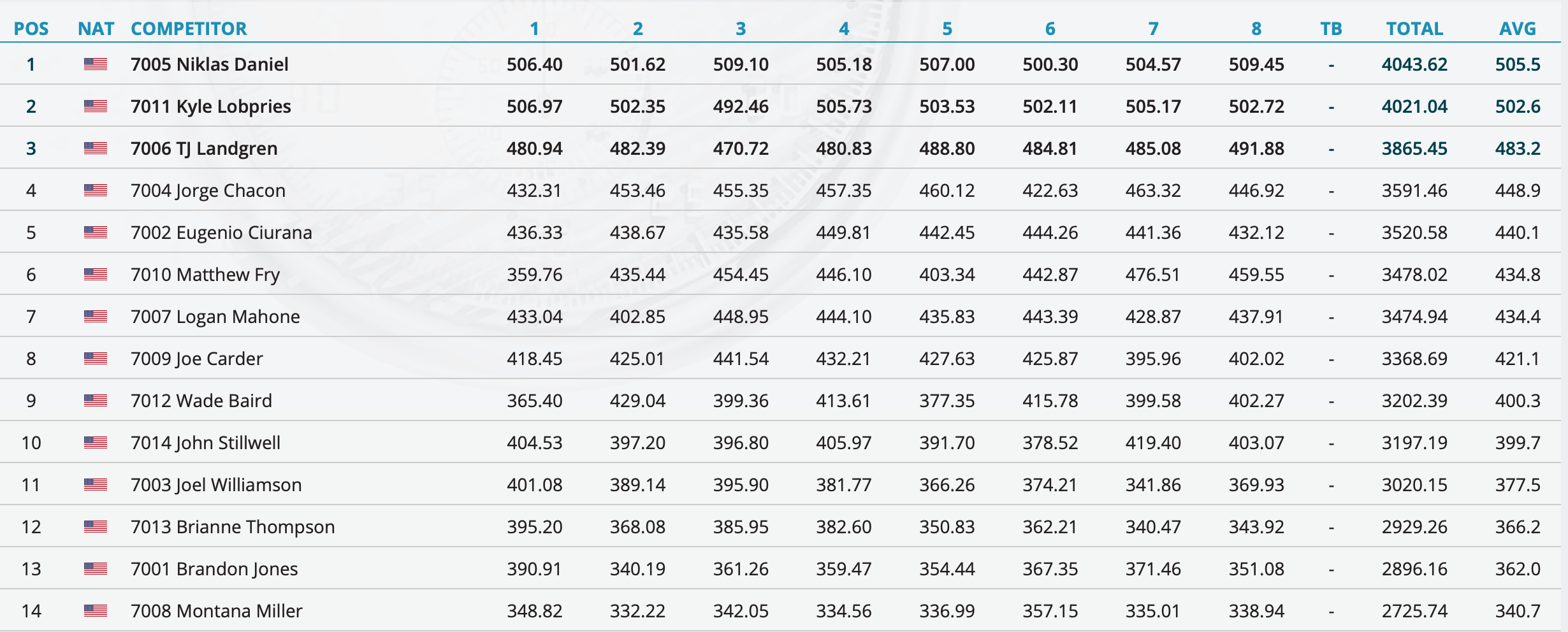 Nik took first place with a total of 4,043.62kmh (2512.59mph), averaging 505.5kmh (314.10mph). He is only the second person, after Marco Hepp during the German Nationals 10Sep22, to consistently break the 500kmh barrier in all 8 rounds. 2021 World Champion Kyle Lobpries reached a total of 4,021.04 (avg 502.6kmh) for second place, and TJ Landgren got third with a total of 3,865.45kmh (avg 483.2kmh).