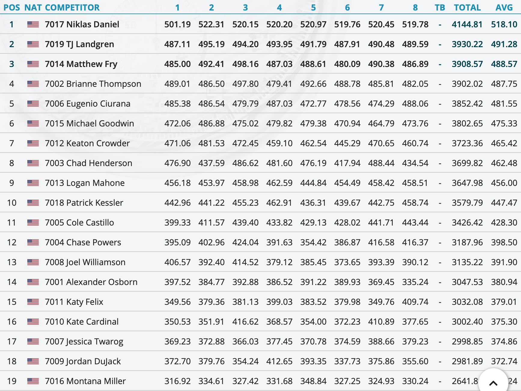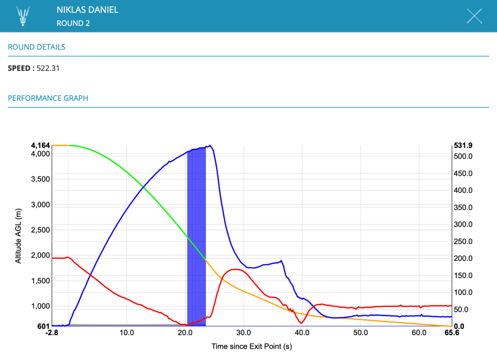 Nik continues to hold onto the number one spot with a third consecutive national title and some new personal competition-bests. His average speed over eight rounds was 518.10kmh (321.93mph), highest scoring round of 522.31kmh (324.55mph), and a competition total of 4144.81kmh. Excluding round 1, where “stuff” happened, Nik was able to remain extremely consistent over the duration of the competition with a standard deviation of only 0.892. Nik broke a total of 9 records, including:
