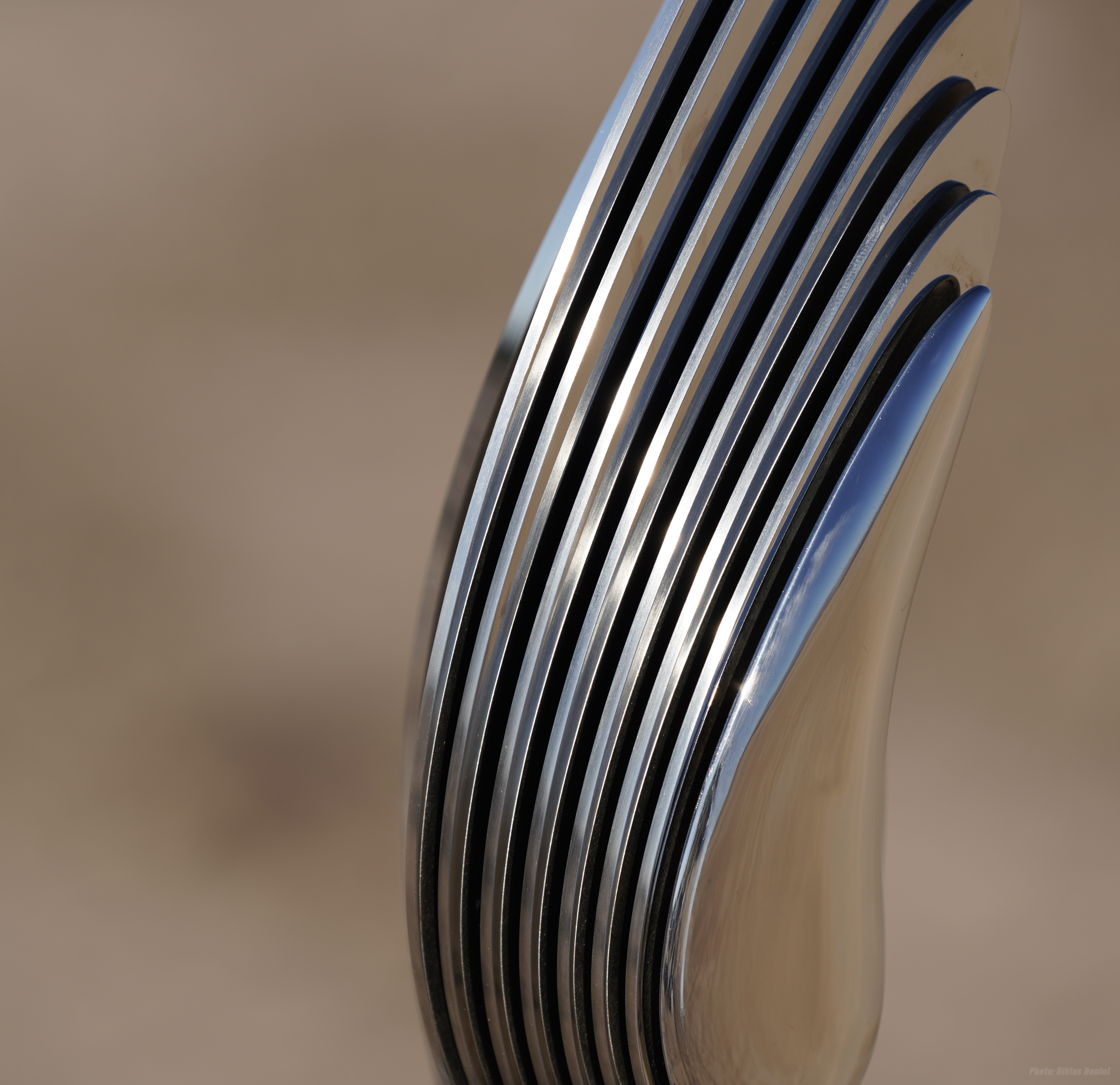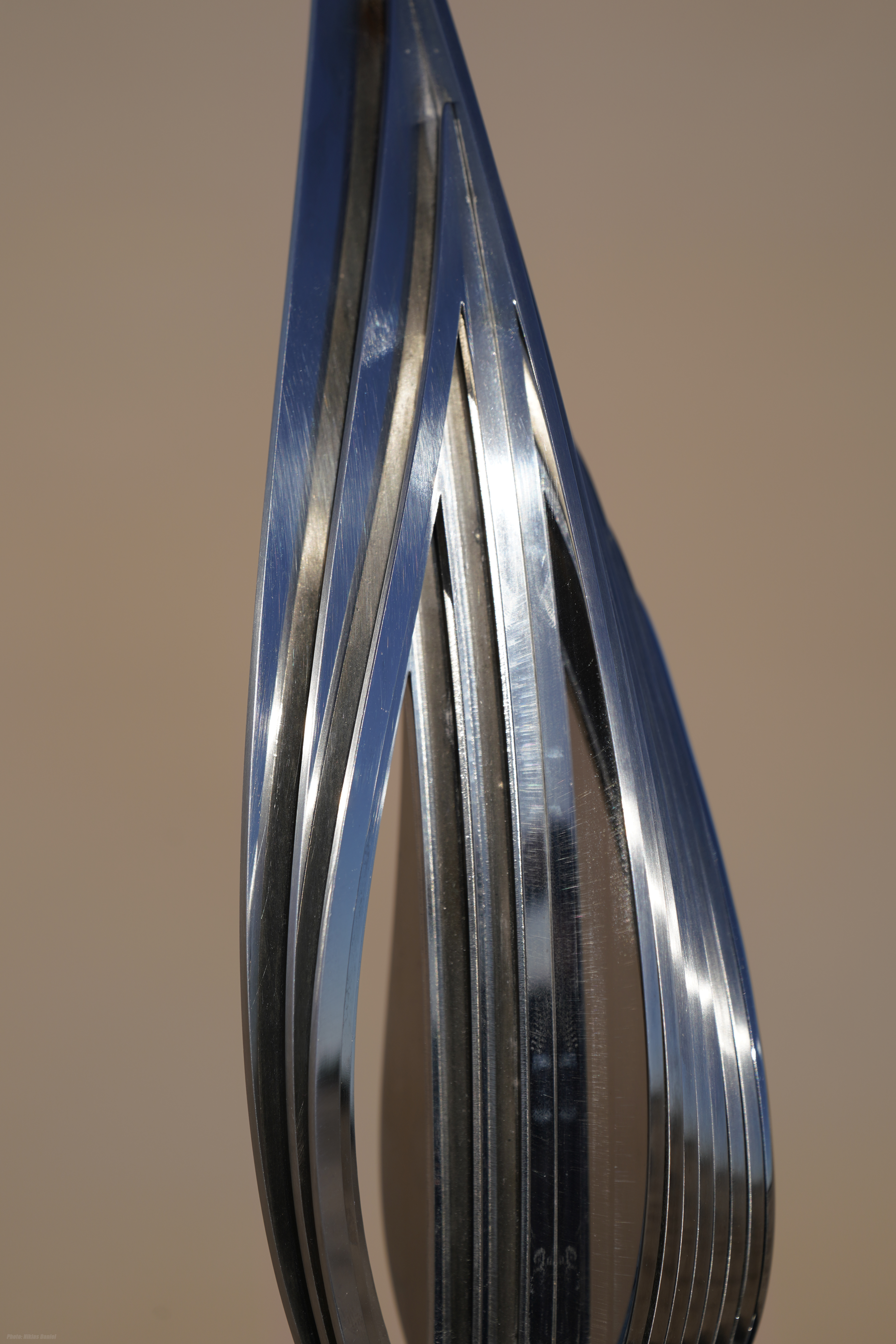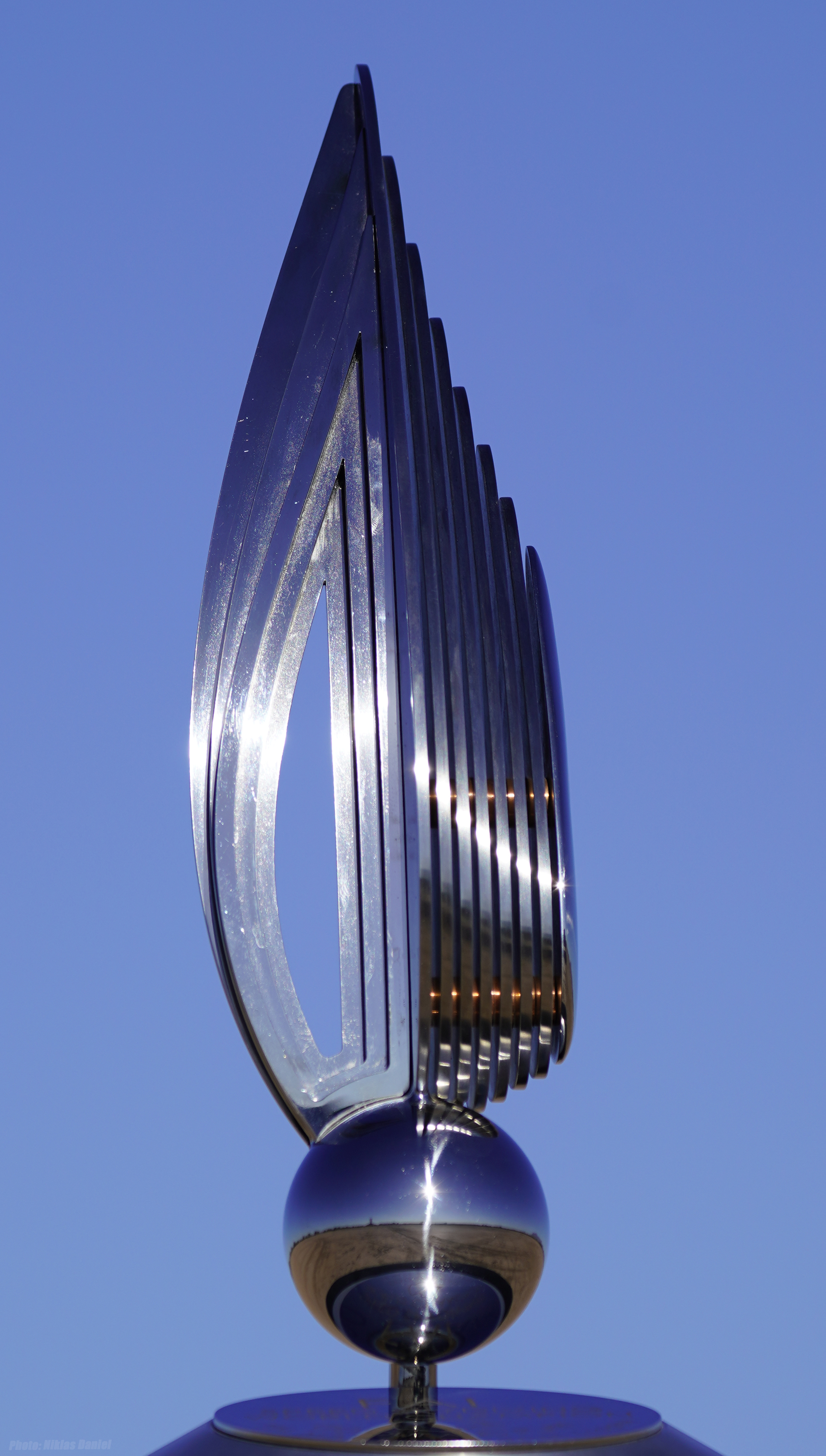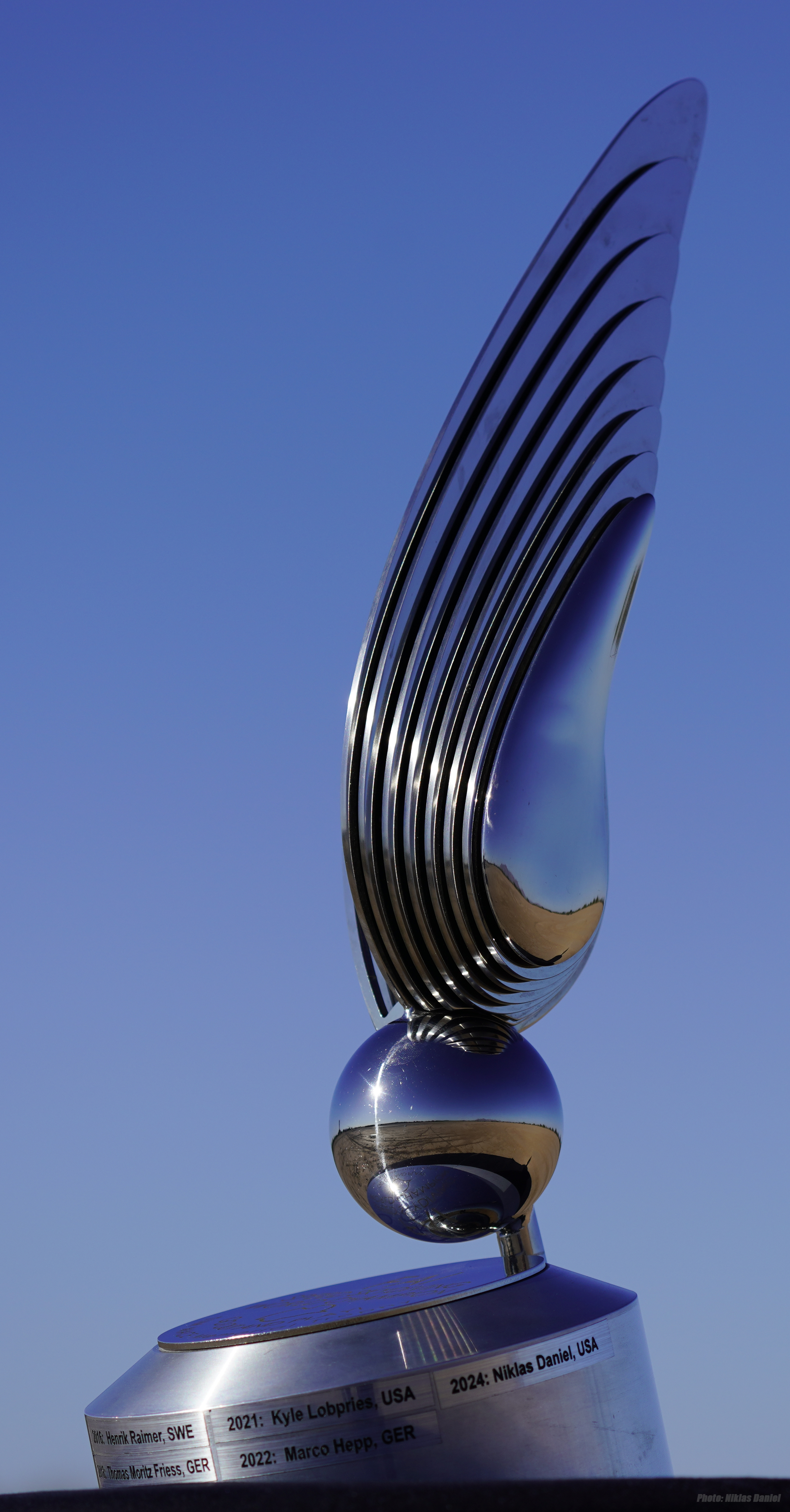 At 16 inches tall and weighing in at 12lbs, the elegant solid stainless-steel trophy resembles a speed skydiver in flight. Beautiful, polished layers of steel plates create the impression of airflow and movement. Around the base of the trophy are small plaques on which the winner’s names accumulate.