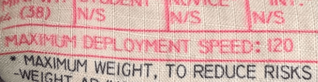 ⚠️ Hey! Check the warning label on the top skin near your canopy’s tail for your parachute’s Skill and Operating Limits. Aim to keep your deployment speed at or below 120 knots (222 km/h / 138 mph)—a key benchmark for safe openings.