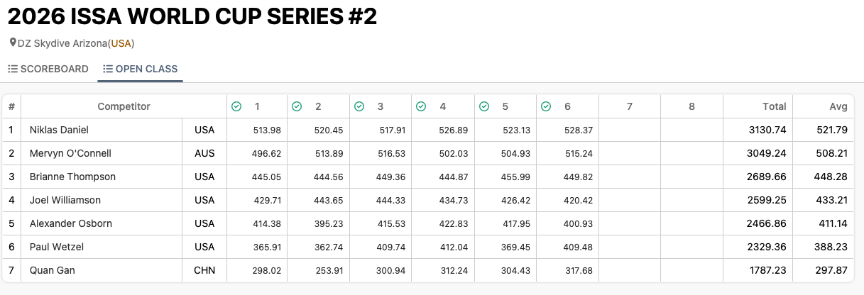 | How the ISSA World Cup Series scoring works: Wherever a competitor did not participate in an event, the result for that meet is scored as zero. The World Cup Series overall result is the sum of each competitor’s two best meet results, regardless of the total number of events completed. Points per meet equal the meet result of a single meet. At the completion of the series, the competitor with the most points is declared the ISSA Speed Skydiving World Cup Series Champion 2026. |