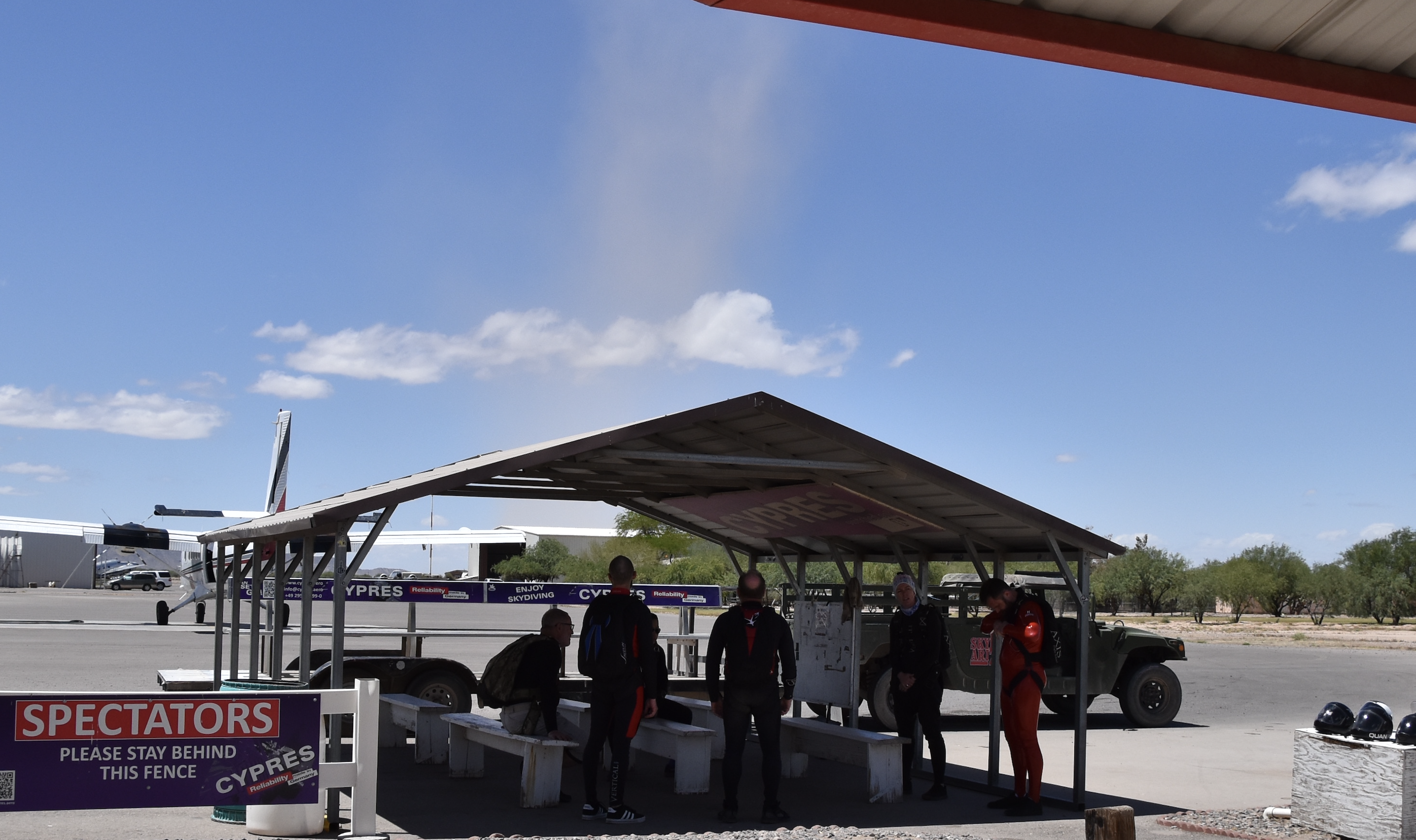 Competitors jumped from Twin Otters. Surface weather conditions were excellent, but a 40 mph crosswind aloft made for more challenging jumps. Despite this, seven competitors were able to exit on a single pass, and everyone made it back to the main landing area without issue. Four rounds were completed before the winds deteriorated (and dust devils formed).
